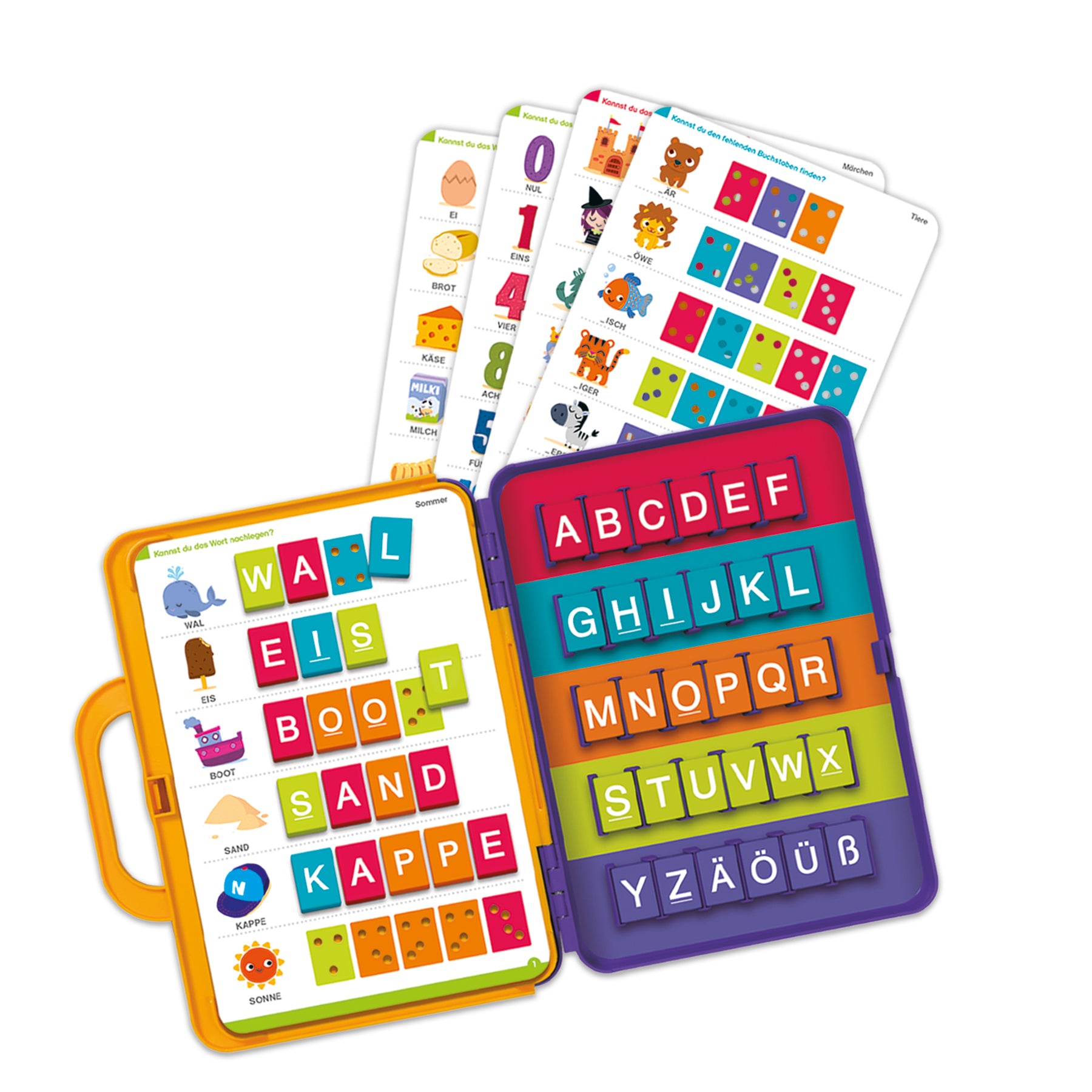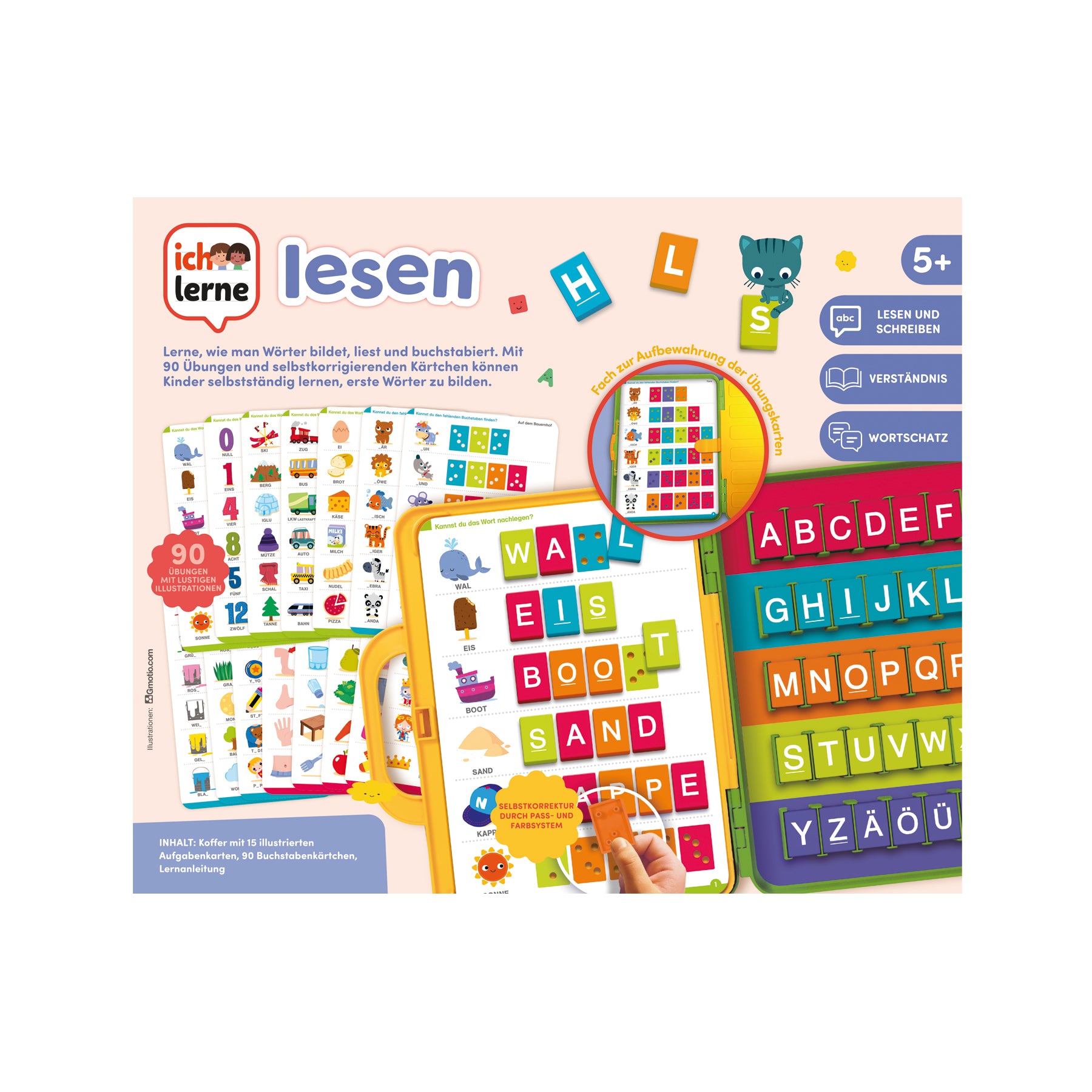 Mit „ich lerne lesen“- lernen Kinder auf spielerische Weise Lesen und Buchstabieren. Alle Wörter sind sorgfältig ausgewählt. Sie bestehen aus höchstens 5 Buchstaben und gehören zum Wortschatz von Kindern ab 5 Jahren. Das spezielle Lernsystem sorgt dafür, dass Kinder selbstständig üben können. Durch die spezielle Rückseite der Buchstabenblöcke passen diese nur an der richtigen Stelle. “ich lerne lesen“- enthält 15 Karten mit 90 Übungen in 3 verschiedenen Schwierigkeitsstufen: Nachlegen von Wörtern, finde den Anfangs-, Mittel- und Endbuchstaben, Buchstabieren von Wörtern. Das Spiel wird in einem praktischen Koffer verstaut- ideal zum Mitnehmen. Mit „ich lerne lesen“ - können Kinder zu Hause das üben, was Sie in der Schule oder im Kindergarten gelernt haben! Ich lerne lesen - Wörter nachlegen - Finde den Anfangs, End- und Mittelbuchstaben - Wörter buchstabieren Inhalt: - 1 Koffer - 15 Karten mit 90 Übungen in 3 Schwierigkeitsstufen 30 Buchstabenblöcke