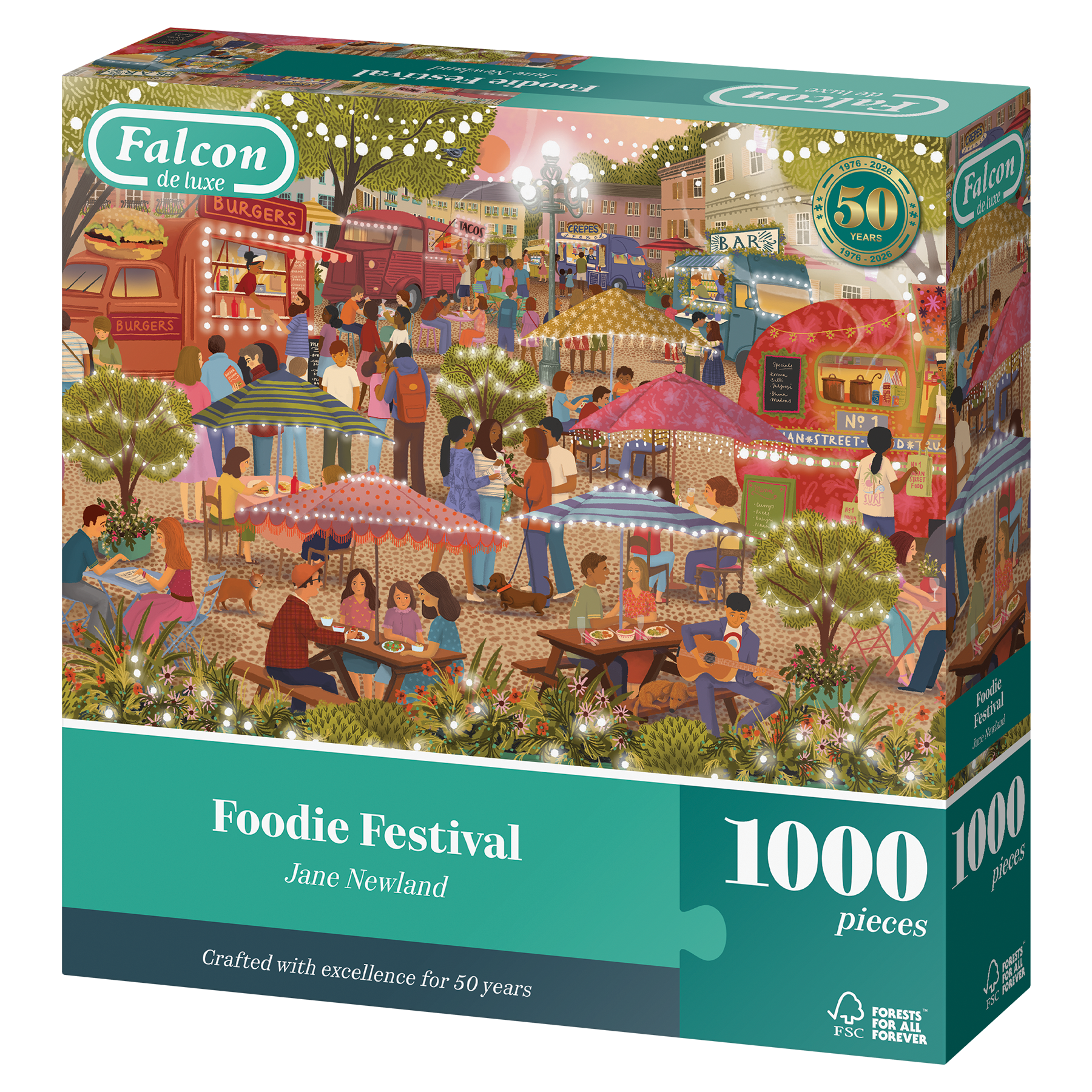 The air is filled with music, laughter, and the delicious aromas of sizzling street food in this vibrant festival scene. Stalls line the square, offering burgers, tacos, crêpes, and more, while friends and families gather under twinkling lights and colourful umbrellas to share a meal. Bursting with charm and detail, this puzzle captures the joy of summer evenings spent together, celebrating good food and good company. Illustrated for Falcon by Jane Newland.