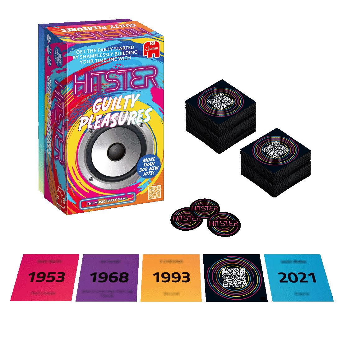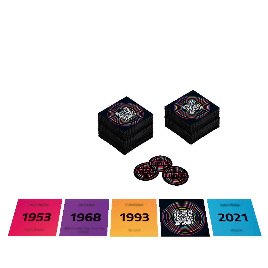 300 music cards, 37 hitster tokens, free Hitster app