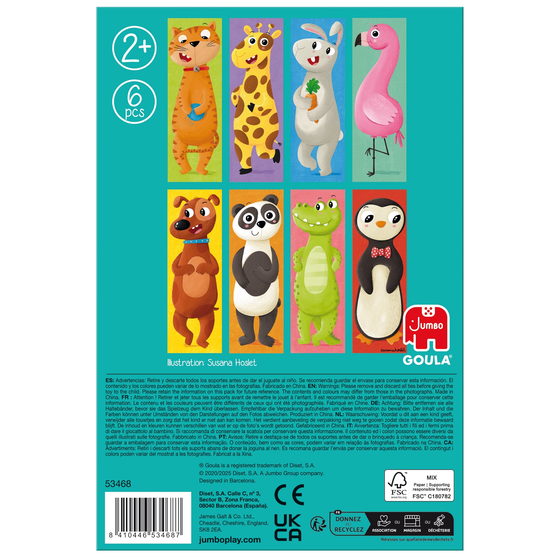 Gira los 6 cubos y haz diferentes combinaciones, aparecerán 8 divertidos animales: un perro, un panda, un gato, una jirafa, un pingüino, un cocodrilo, un conejo y un flamenco. Puedes combinar los cubos para ver los diferentes animales o puedes mezclarlos para crear nuevas imágenes. El color del fondo de la ilustración ayudará a los niños a formar el puzle correctamente.