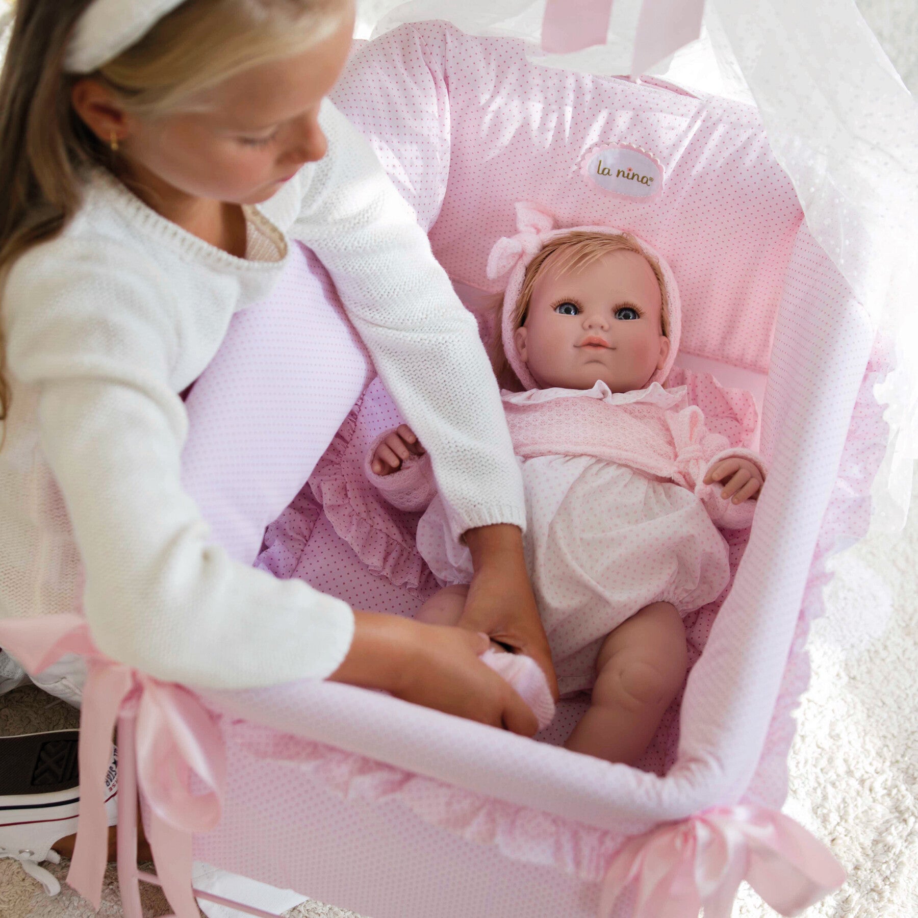 Cuna moisés con dosel para tus muñecas en topito rosa. Ideal para muñecas de 30 a 50 cm. Plegable, ocupa poco espacio, fácil montaje. Acabados de calidad, solida y estable. Juguete de imitación.