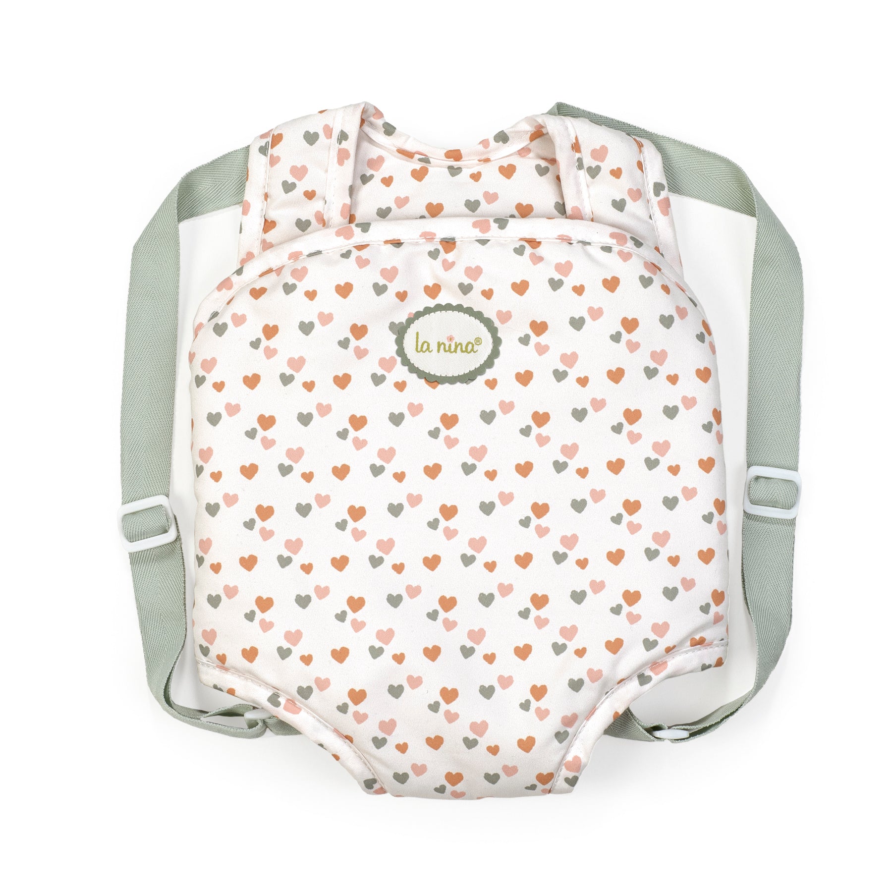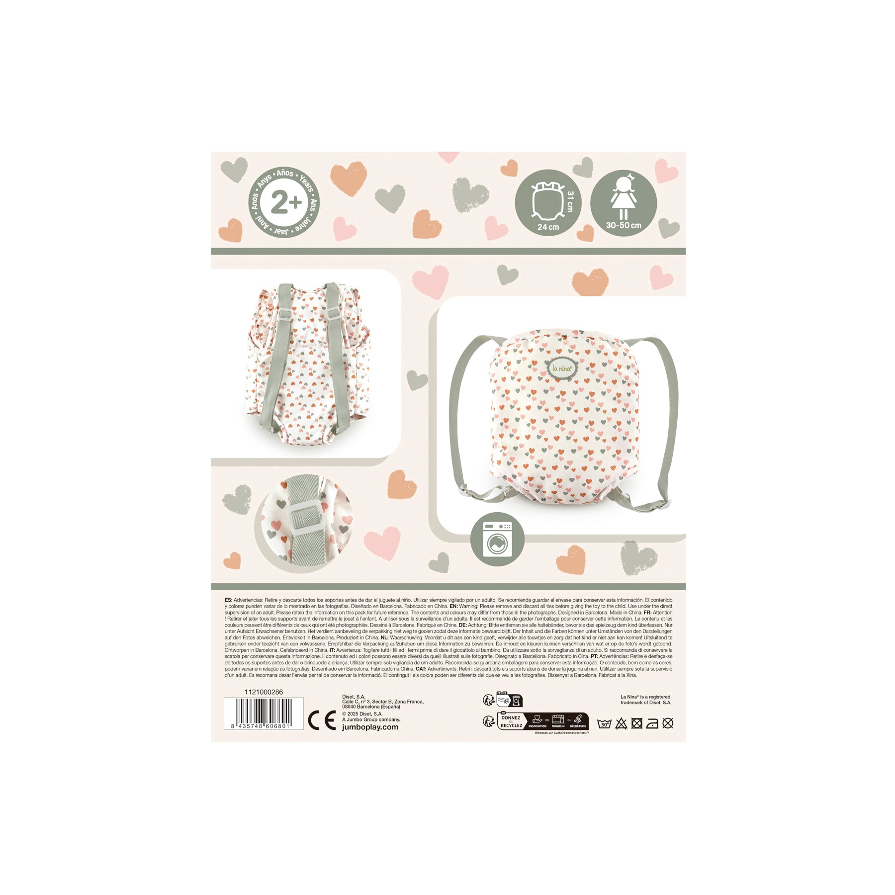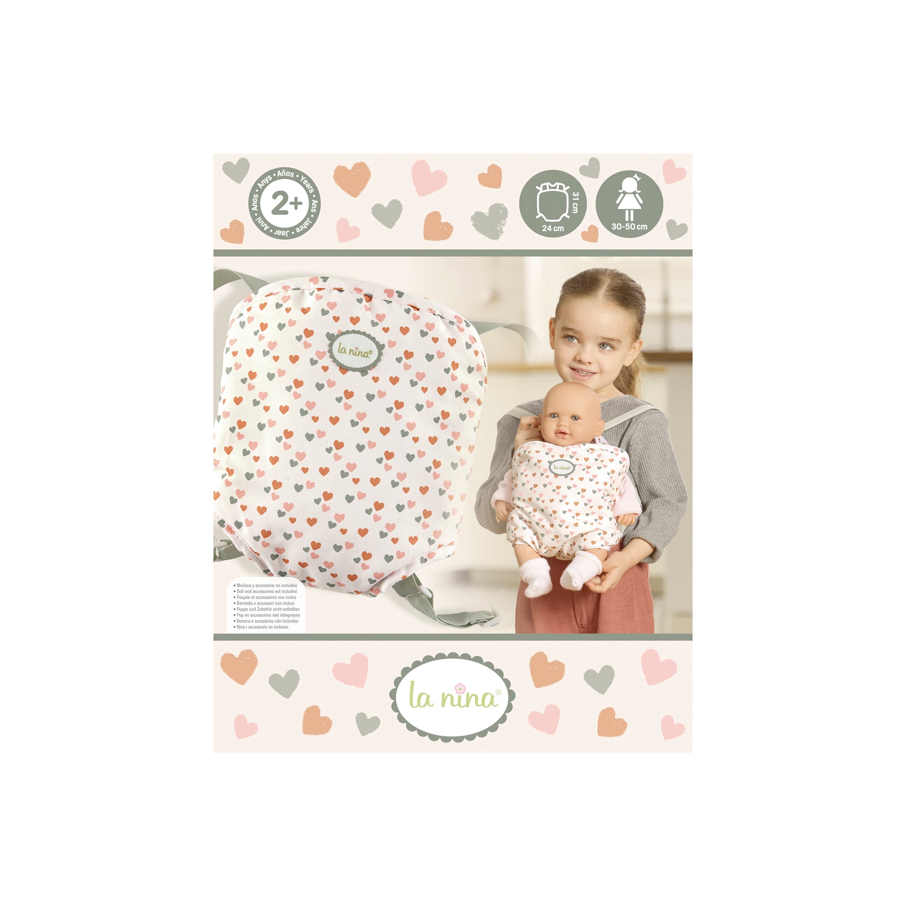 Mochila portabebés cómoda y práctica, con asas regulables. Adecuada para muñecos de 30 a 46 cm y lavable a máquina. Recomendada a partir de 2 años. Este es un juguete de imitación.