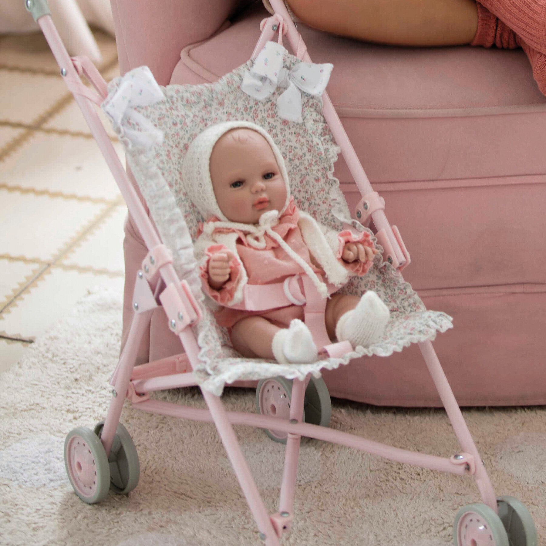 Saca a pasear a tus muñecas con la sillita de paseo Violeta pequeña con flores, plegable con sistema de tijera, muy práctica. Estructura de metal lacada en color rosa. Tu primera sillita de paseo, especialmente indicada de 3 a 5 años. Ideal para muñecas de 30 a 42 cm.