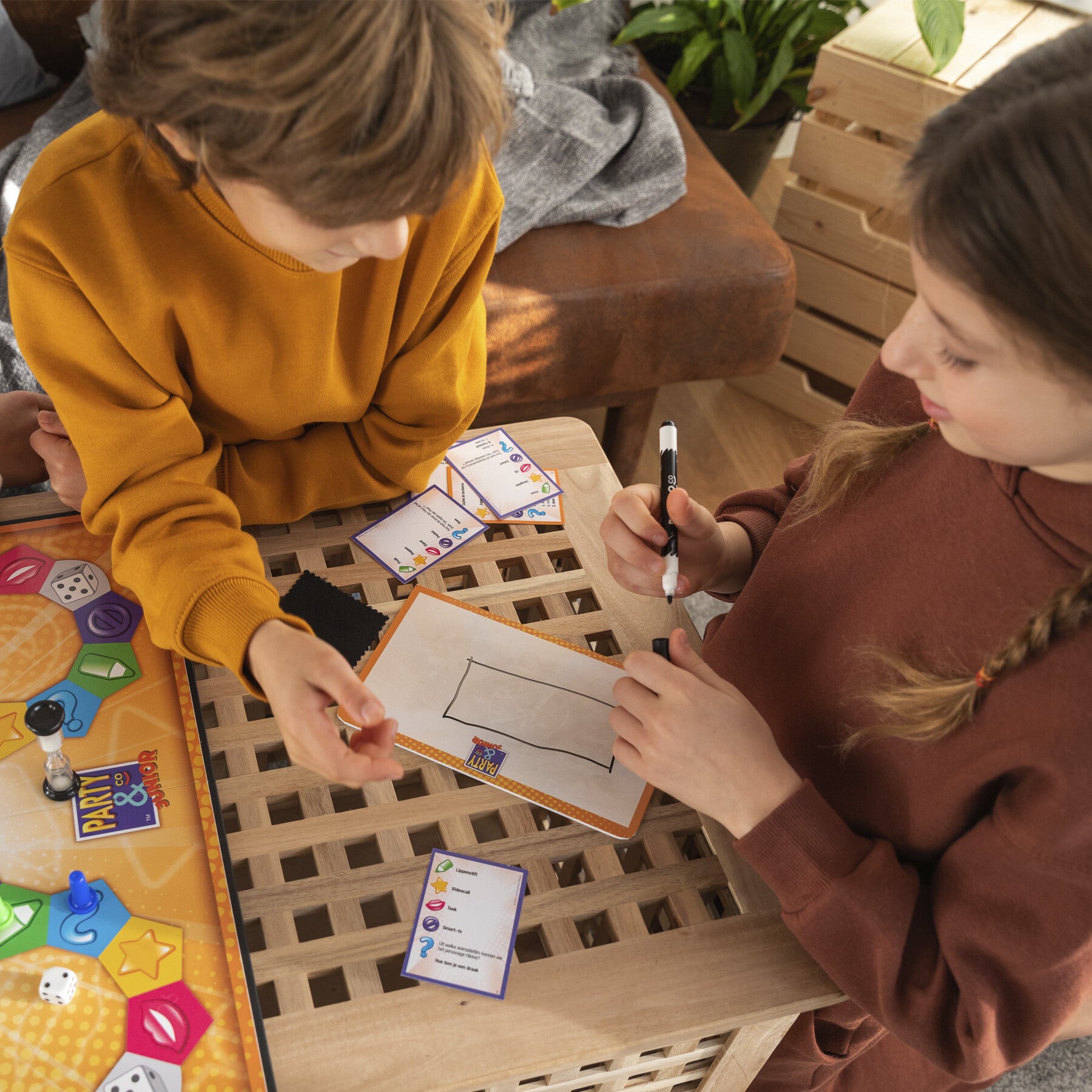 Party & Co. Junior conté 112 targetes, un tauler, un dau, un rellotge de sorra de 30 segons, un llapis de cera, una pissarra per a dibuixar, una camussa per a esborrar, 4 fitxes i una carta de codis de les proves.