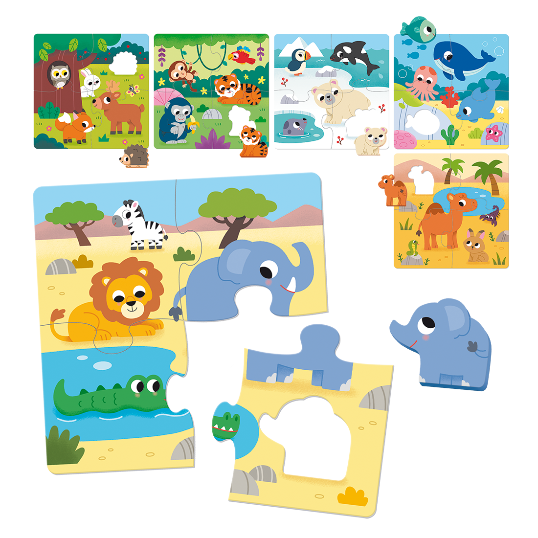 Un ensemble de 6 puzzles composés de quatre pièces chacun, présentant chacun un animal différent dans son habitat naturel. Du chameau dans le désert au tigre dans la jungle, les enfants découvriront une variété d'environnements en jouant. Chaque puzzle comprend un animal en bois magnifiquement conçu qui complète la scène, invitant les tout-petits à associer, explorer et apprendre. Parfait pour développer la perception spatiale, la motricité fine et un amour de la nature grâce à un jeu pratique.