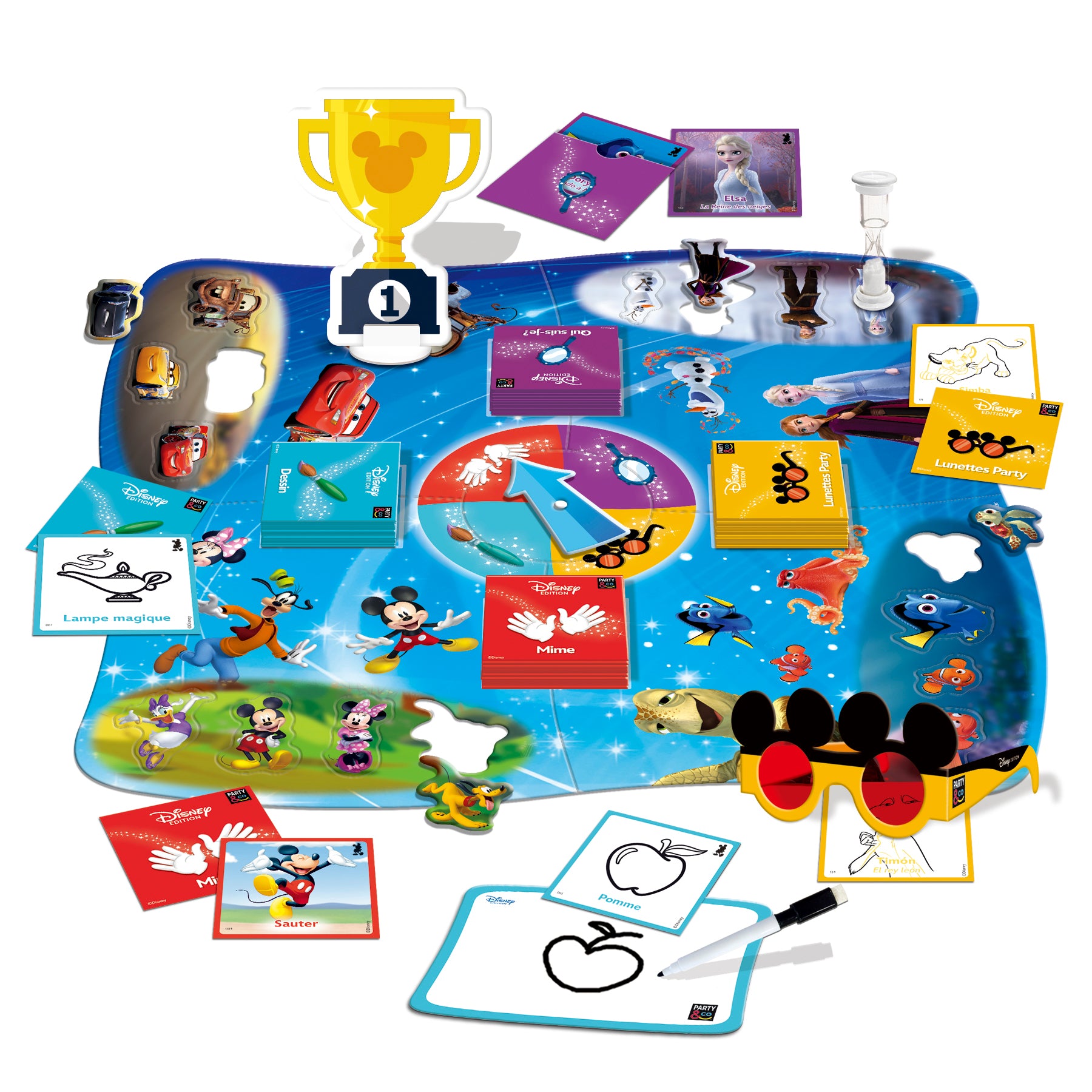240 cartes défis (60 par catégorie), PartyRoulette, Lunettes Party, adoise magique et style effaçable, 4 pièces du plateau-puzzle, 16 personnages Disney, trophée de Mickey, sablier (30 secondes) et Pochette Miroir Qui suis-je?