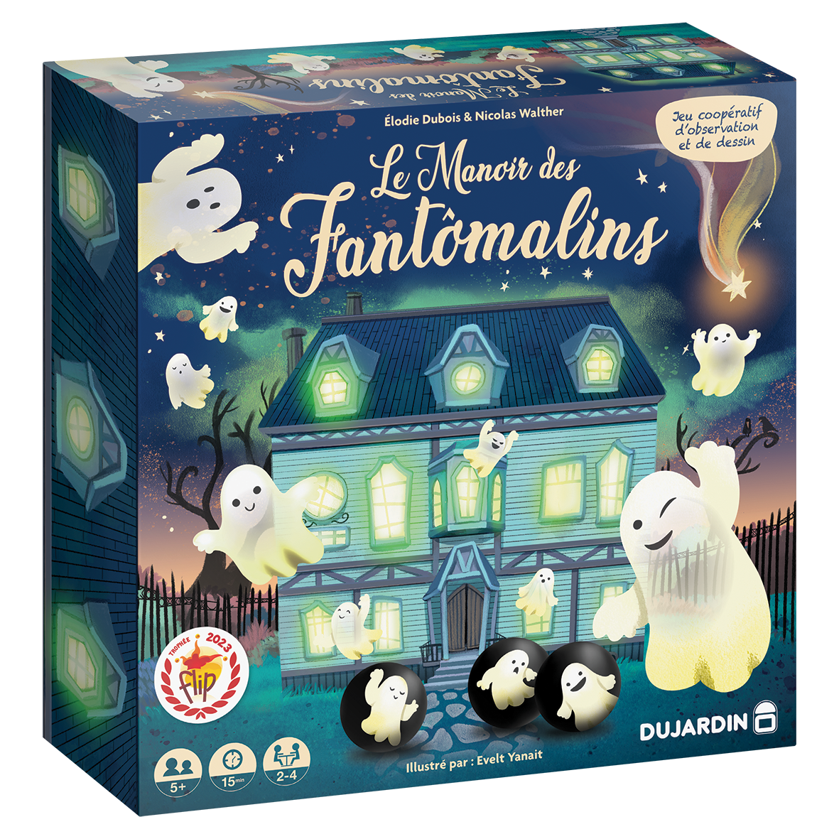 - IMMERSIF : Le Manoir des Fantômalins séduit par son univers graphique soigné et son matériel immersif : un plateau coloré et des illustrations qui plongent petits et grands dans l’ambiance d’un manoir hanté plein de surprises.