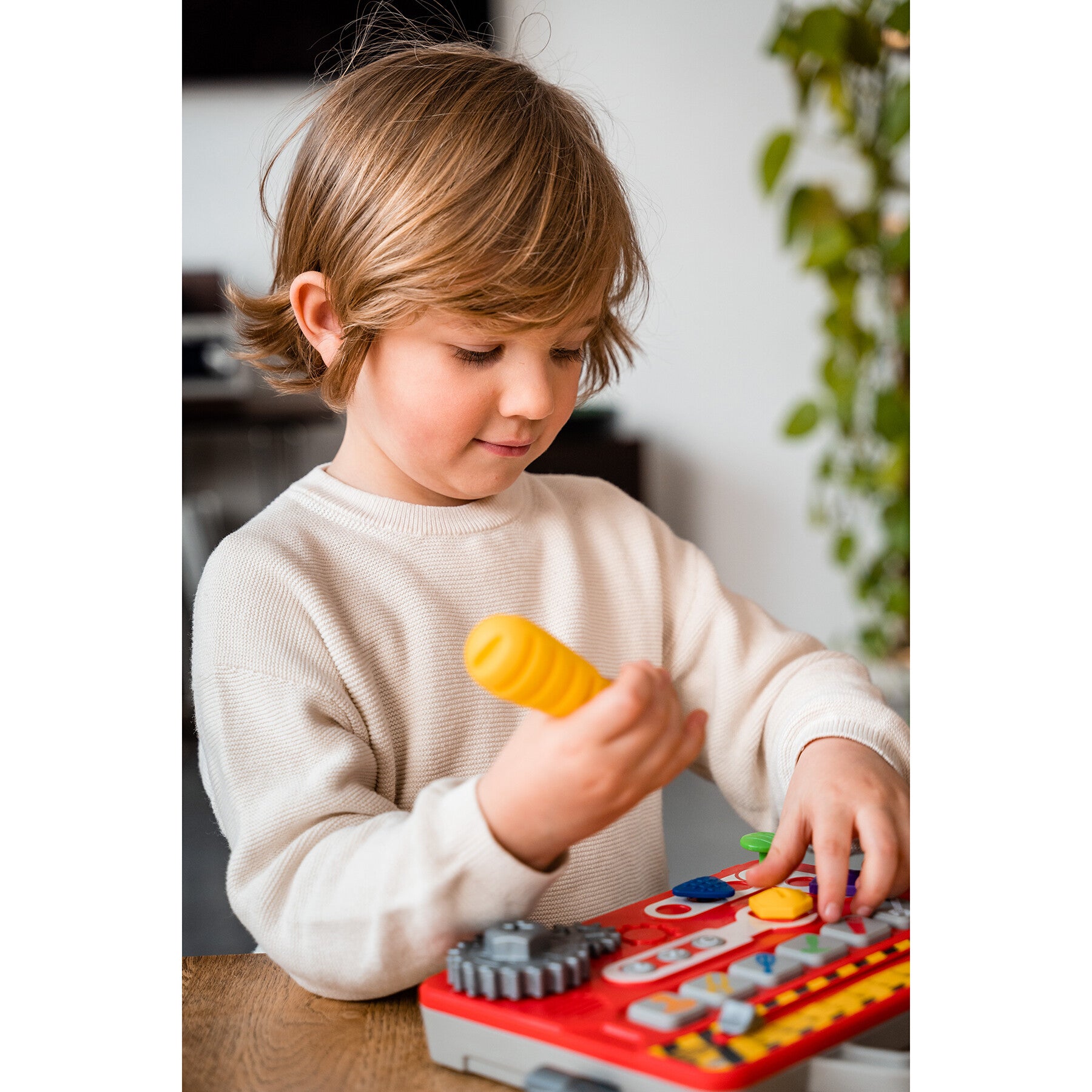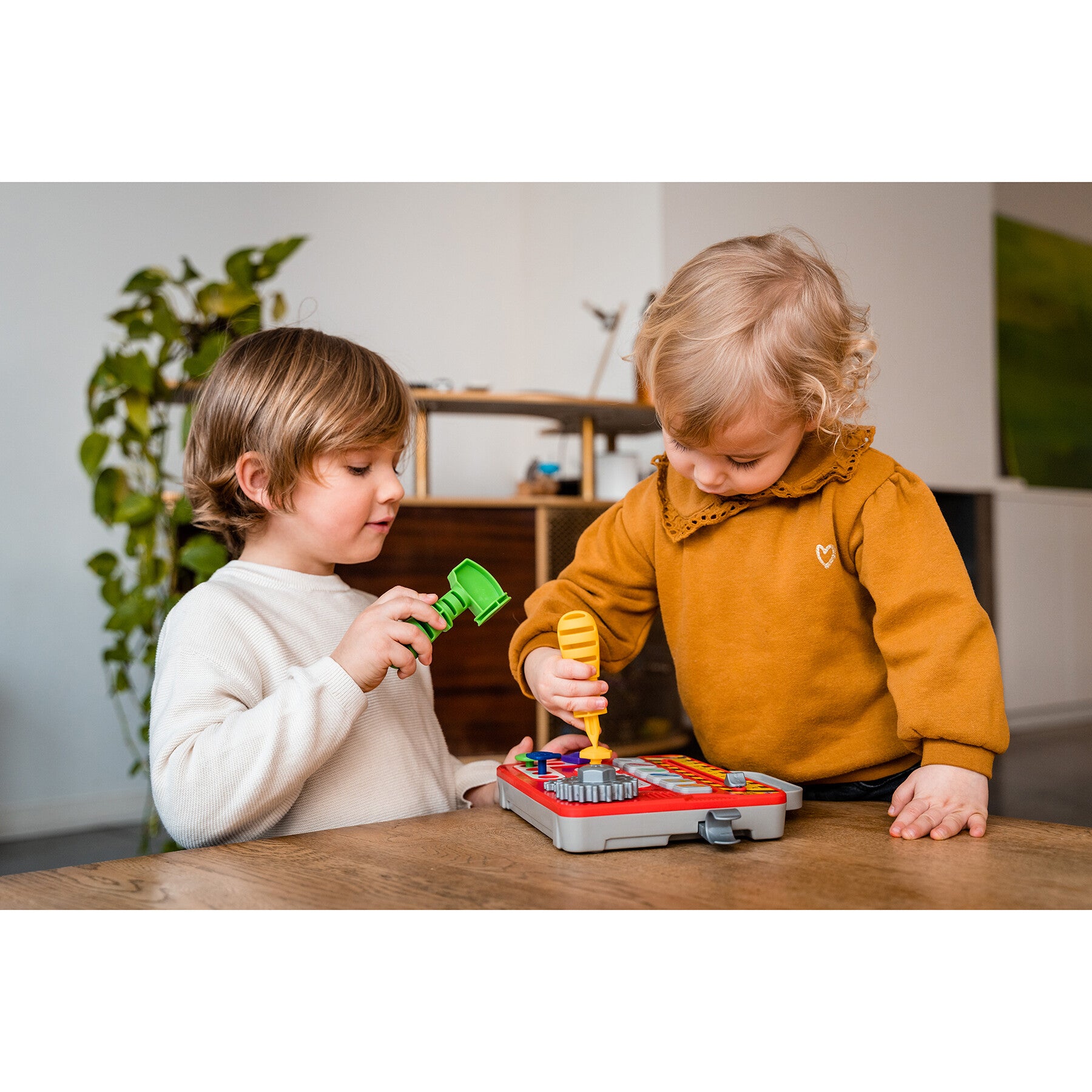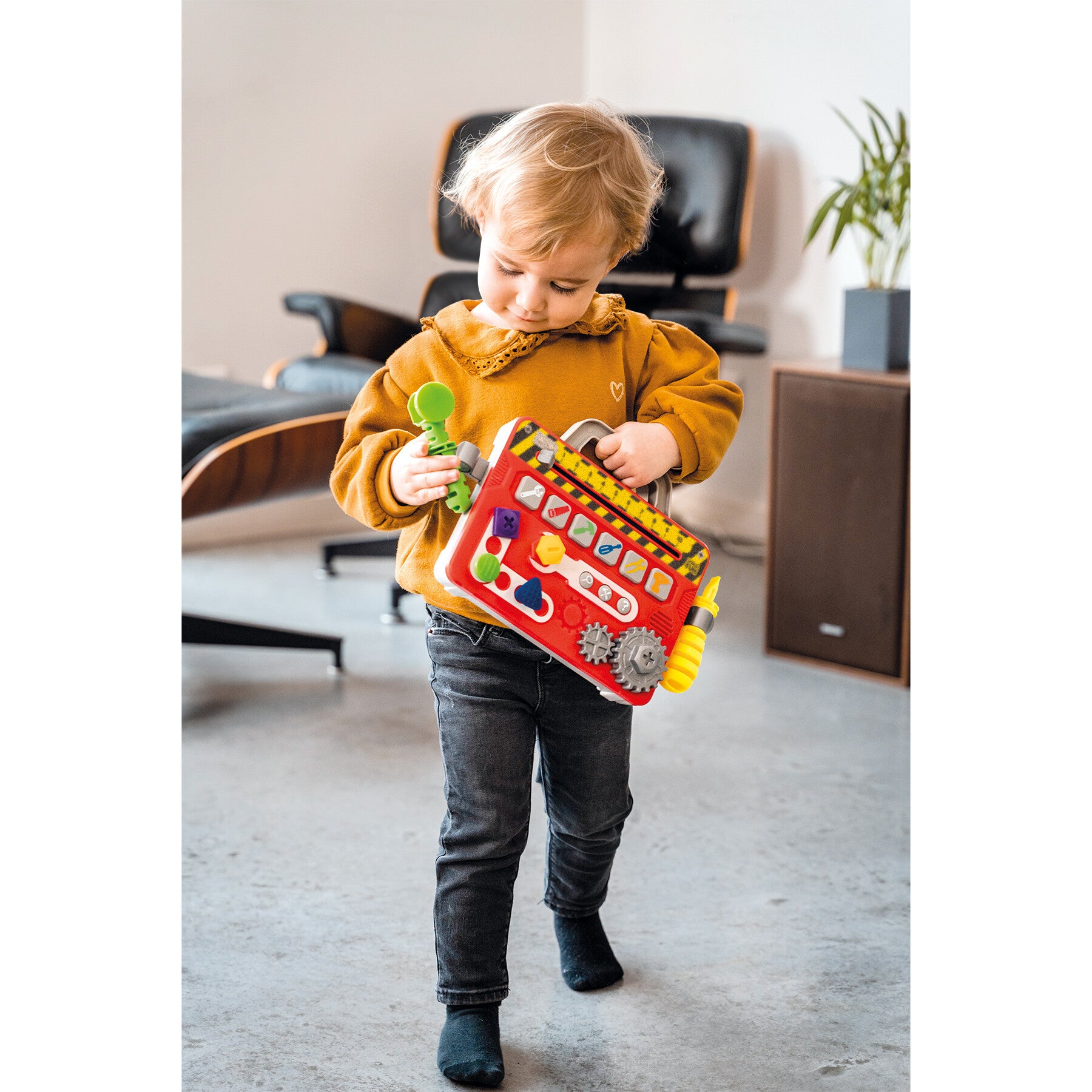 3 modes de jeu : imitation, découverte et quiz pour apprendre les chiffres, couleurs, formes, nommer les outils et comprendre leur utilisation… Une mallette facile à emporter partout pour les petites mains. Il suffit d’accrocher le marteau et le tournevis de chaque côté, d’attraper la poignée et c’est parti pour une intervention !