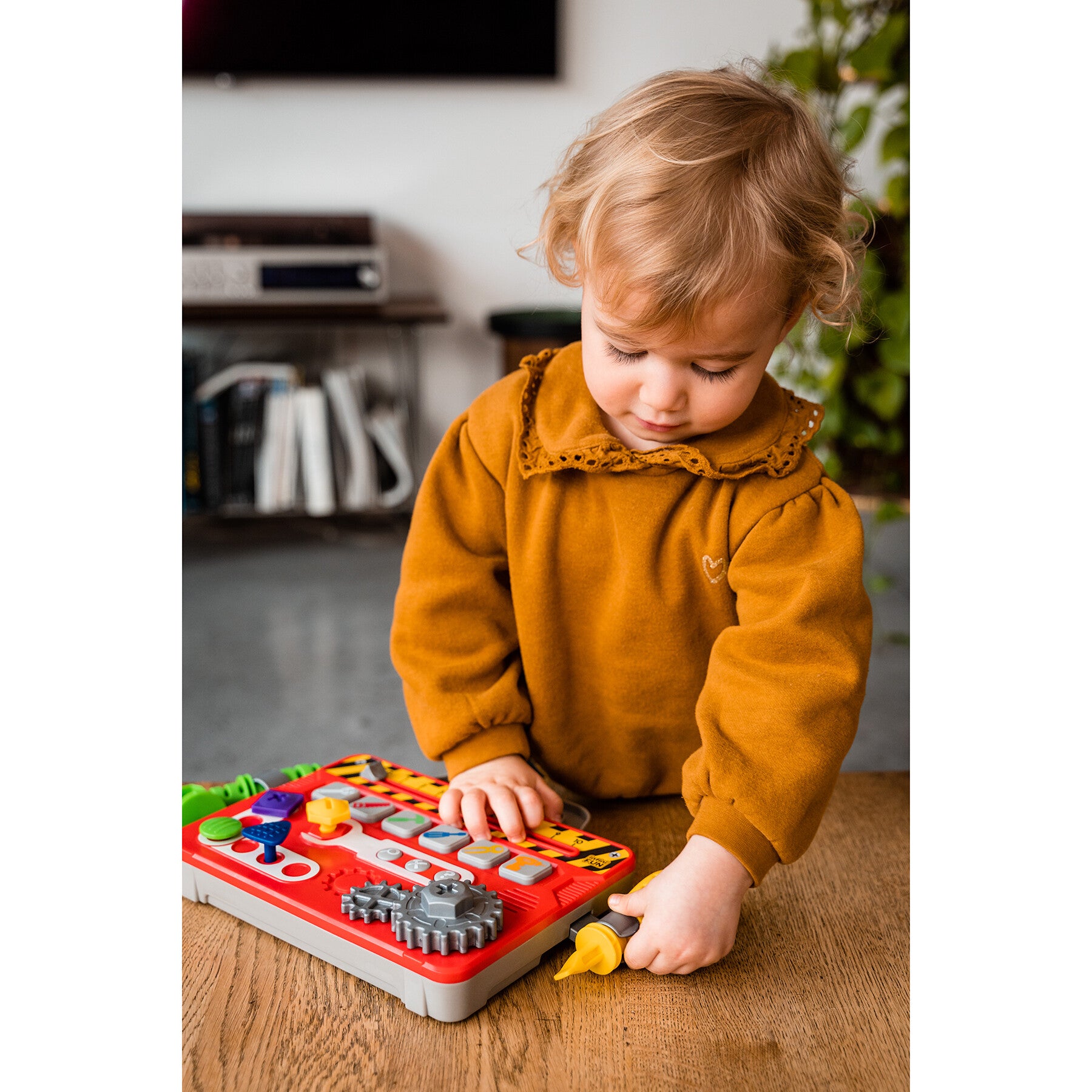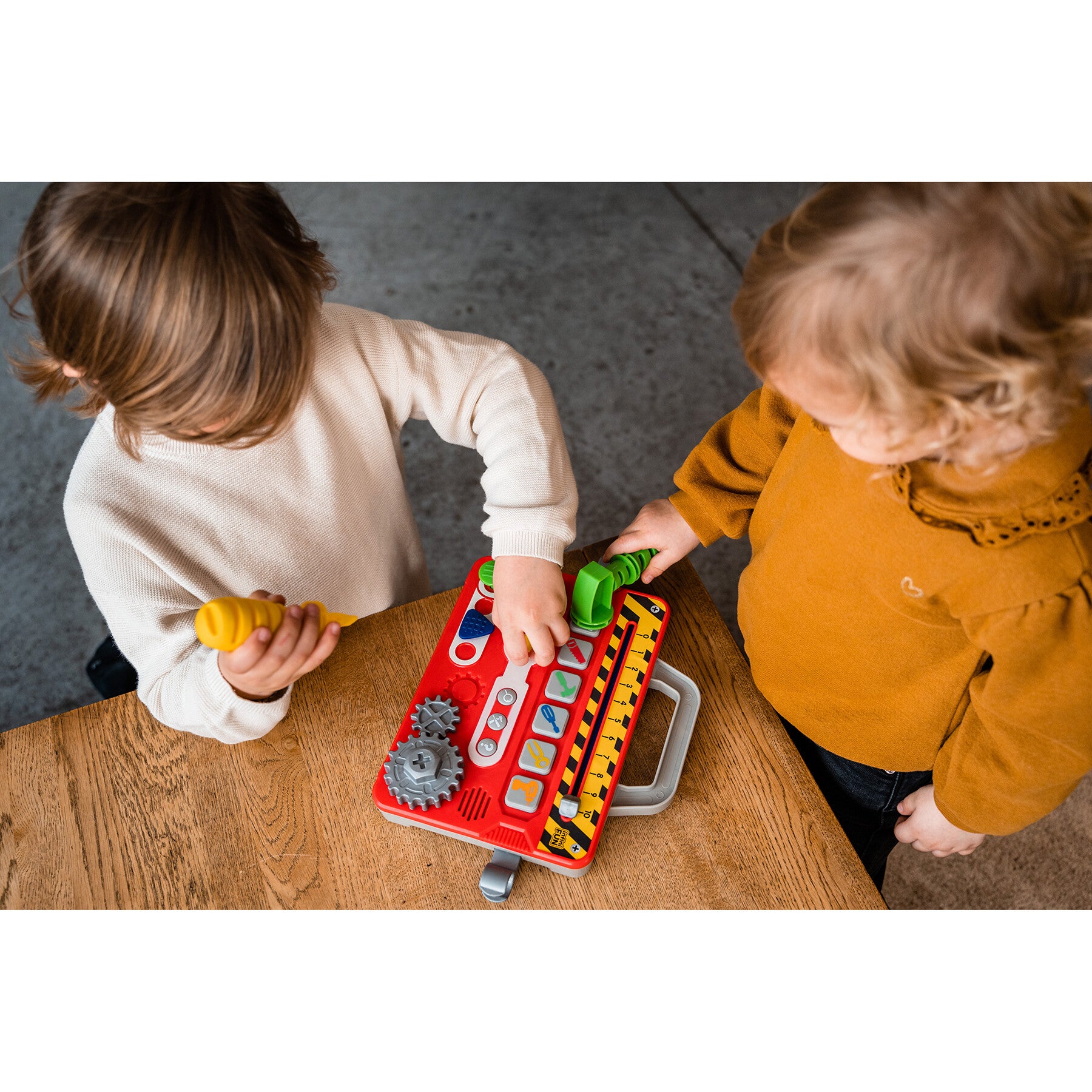 La première mallette à outils des tout-petits ! Les tout-petits adorent bricoler comme les parents. Avec cette mallette, il n'y a aucun risque de se blesser ou de perdre une vis ! Ces 6 activités : visser ou dévisser, tourner les roues, taper avec le marteau, faire glisser le mètre, tirer les clous vont permettre à l’enfant de développer sa motricité.