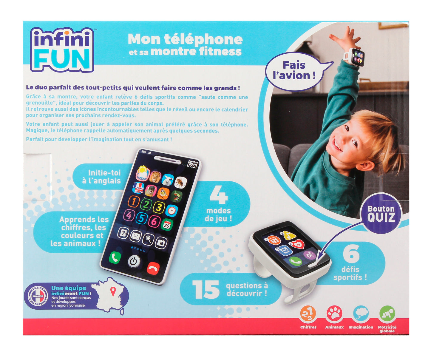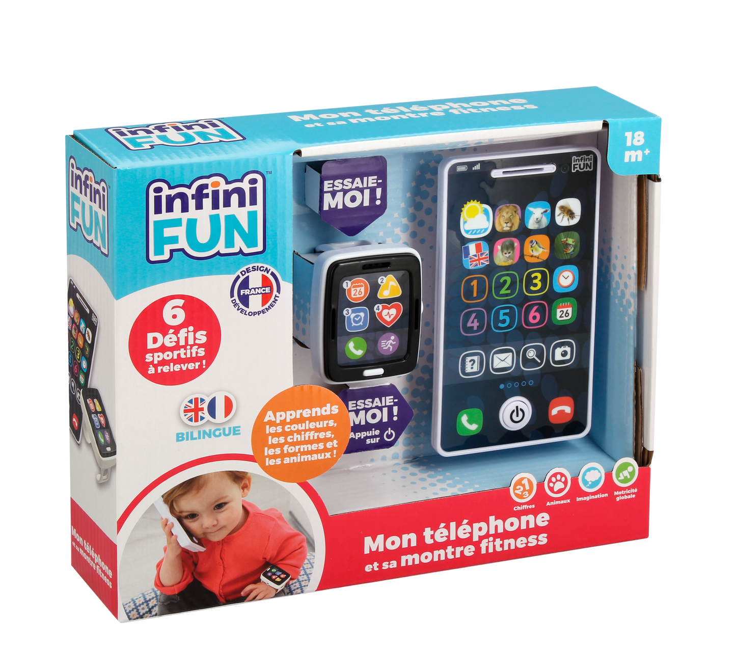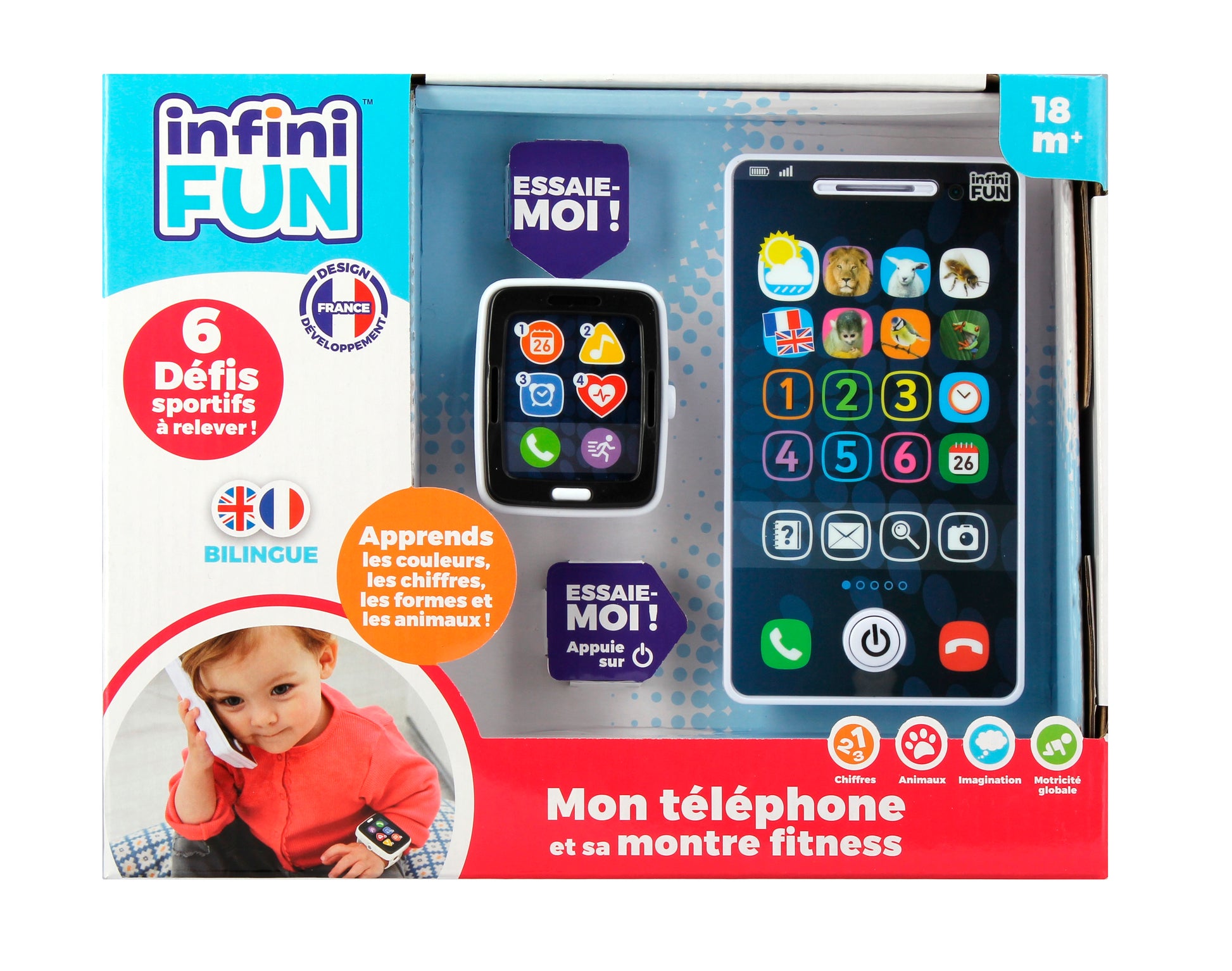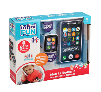 Comme les grands, les tout-petits ont eux aussi leur montre fitness et leur téléphone ! La montre offre 6 défis sportifs pour les encourager à faire du sport (danser, sauter, tourner…) tout en s’amusant. Ils pourront aussi faire semblant de passer des appels, écouter de la musique ou encore organiser leurs prochains rendez-vous avec le calendrier ! Grâce aux 4 modes de jeu du téléphone, votre bébé apprend à son rythme les chiffres, les couleurs, les noms des animaux, leurs caractéristiques et leurs cris. Le téléphone rappelle automatiquement après quelques secondes pour encore plus de fun.