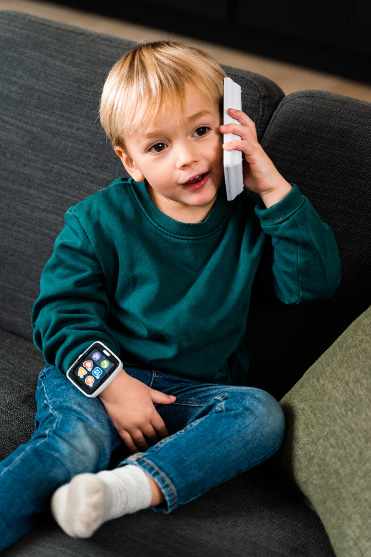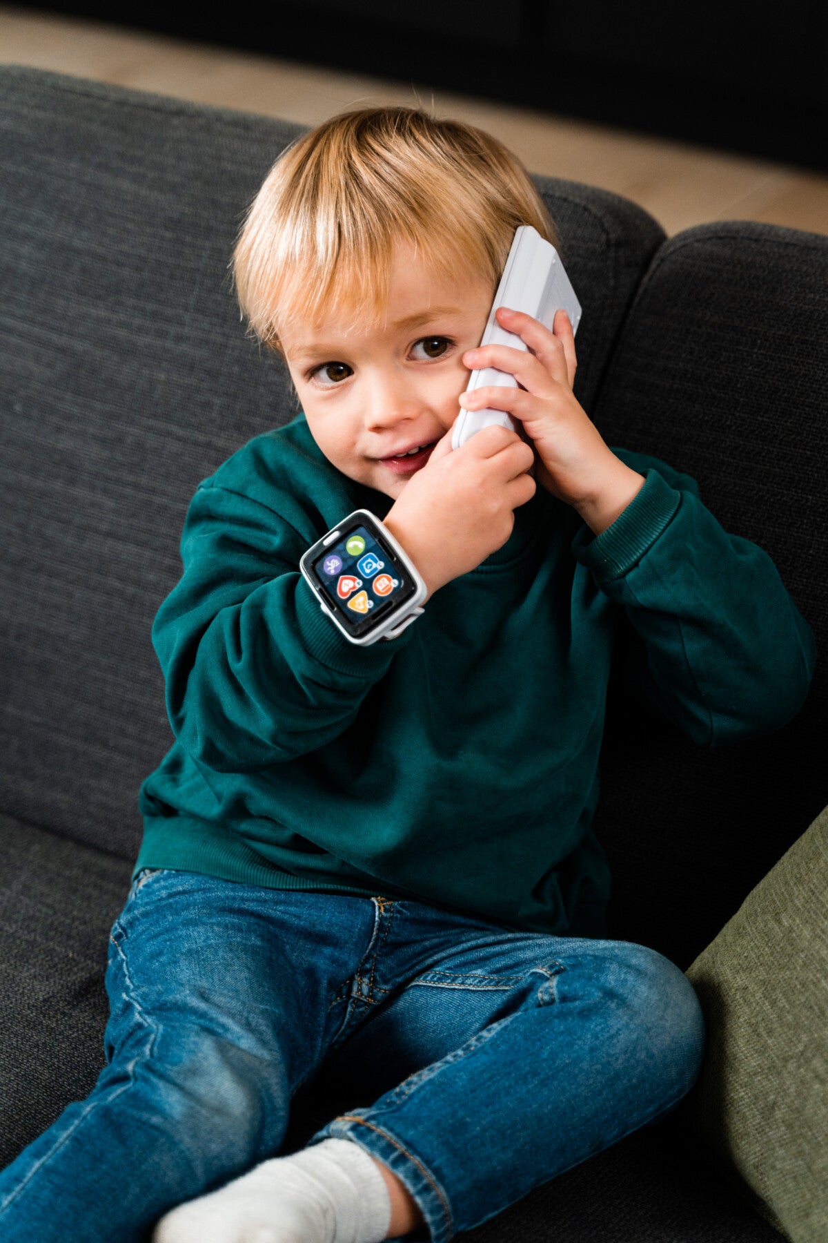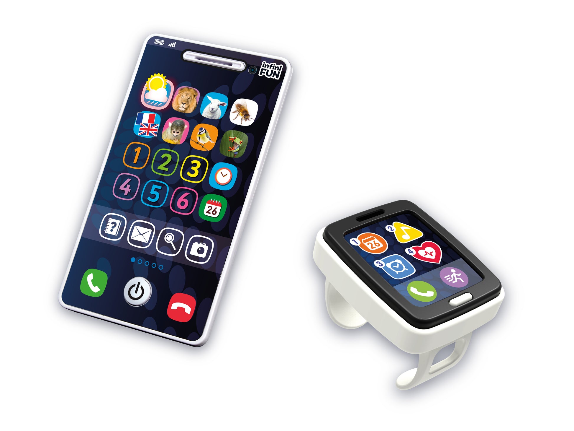 Comme les grands, les tout-petits ont eux aussi leur montre fitness et leur téléphone ! La montre offre 6 défis sportifs pour les encourager à faire du sport (danser, sauter, tourner…) tout en s’amusant. Ils pourront aussi faire semblant de passer des appels, écouter de la musique ou encore organiser leurs prochains rendez-vous avec le calendrier ! Grâce aux 4 modes de jeu du téléphone, votre bébé apprend à son rythme les chiffres, les couleurs, les noms des animaux, leurs caractéristiques et leurs cris. Le téléphone rappelle automatiquement après quelques secondes pour encore plus de fun.