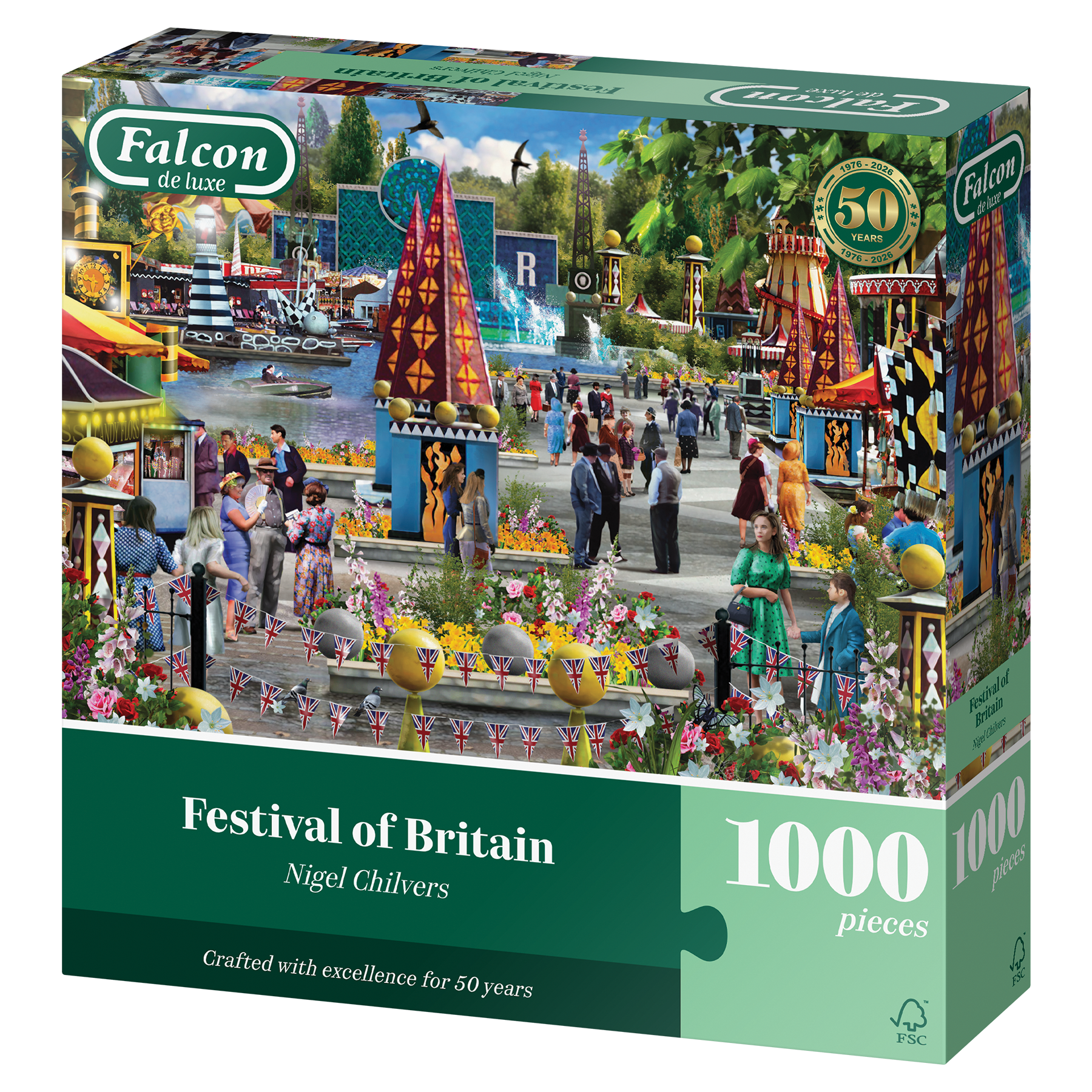 Geïnspireerd door het Festival of Britain, toont deze levendige scène vrienden en families die wandelen tussen opvallende paviljoens, waterpartijen en kleurrijke tuinen in Battersea Park tijdens de zomer van 1951. Deze puzzel viert een vreugdevol moment in de tijd waarin Groot-Brittannië samenkwam om een positieve kijk op zijn naoorlogse toekomst te presenteren. Geïllustreerd voor Falcon door Nigel Chilvers.