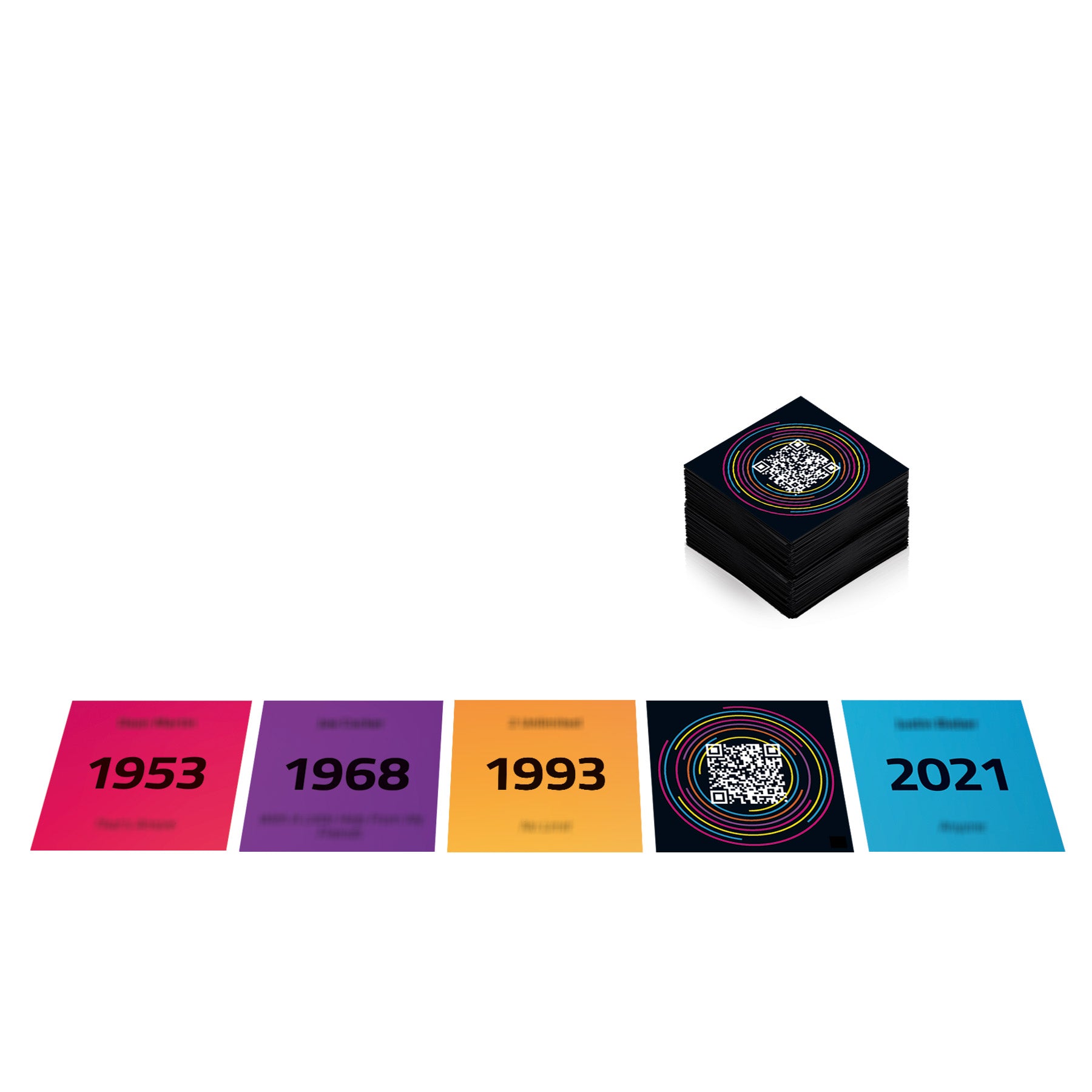 Kies een muziekkaart en scan de QR-code met de Hitster app om het lied automatisch af te spelen op Spotify*. Raad wanneer het nummer is uitgebracht en plaats de kaart op de juiste plaats in jouw muziektijdlijn. Draai de muziekkaart om. Heb je het jaartal goed geraden? Dan hou je de muziekkaart om je tijdlijn verder mee uit te bouwen.