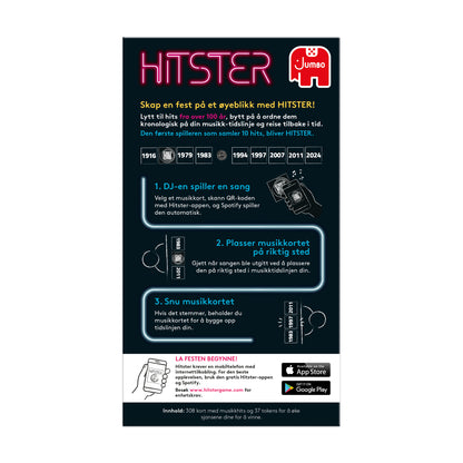 The music party game of the century that creates an instant party! Take a trip down memory lane with 300 hits from the last 100 years. The DJ scans a music card with the free app and players take turns guessing when the songs were released, artist names and song titles. First player to have a timeline of 10 songs wins this digitally integrated party game!