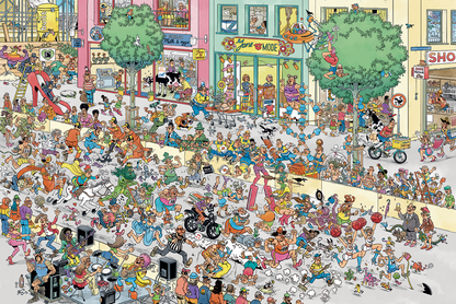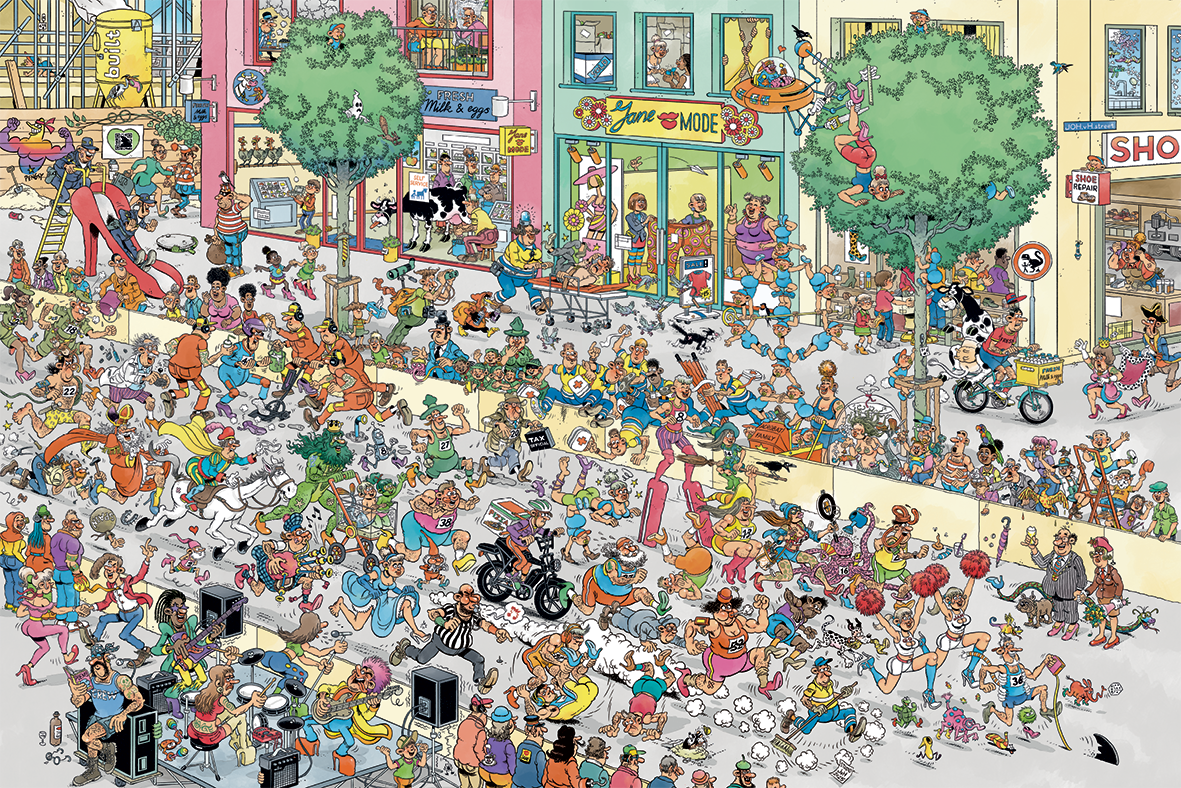 A Jan van Haasteren puzzle is so much more than just a puzzle; it’s an adventure series with familiar characters playing the lead roles in a never-ending decor full of absurd details. Discover the crazy adventures of the Jan van Haasteren family! We are proud that our puzzles are made from recycled cardboard in Europe. To cut the cardboard into puzzle pieces, we use the thinnest knife available. The puzzle has an almost seamless look when finished. Enjoy this Jan van Haasteren puzzle!